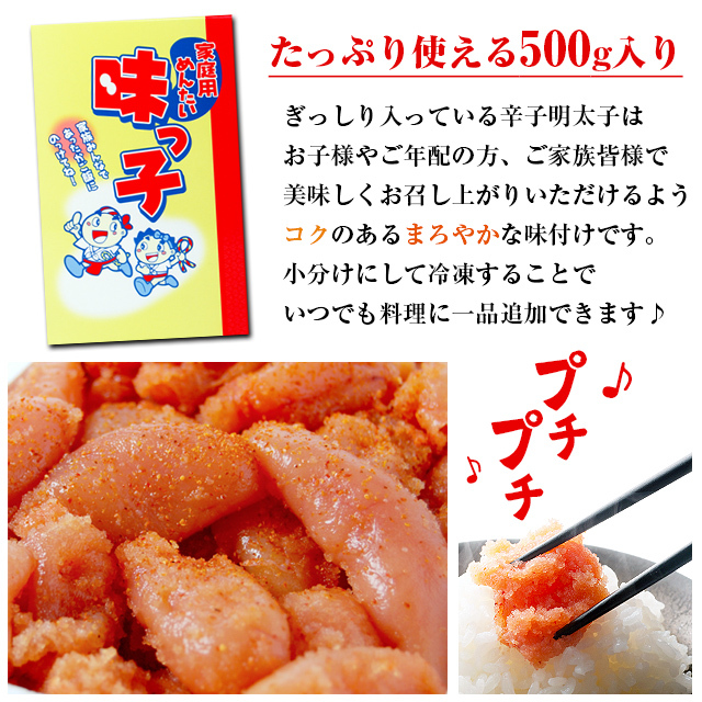 | 原材料 | すけとうだらの卵巣(ロシア又はアメリカ)、発酵調味料、食塩、唐辛子、かつお風味調味料/調味料(アミノ酸等)、甘味料(ソルビット)、酸化防止剤(ビタミンC)、ナイアシン、酵素、着色料(赤102、黄5、赤3)、発色剤(亜硝酸Na)、(一部に小麦・大豆を含む) |