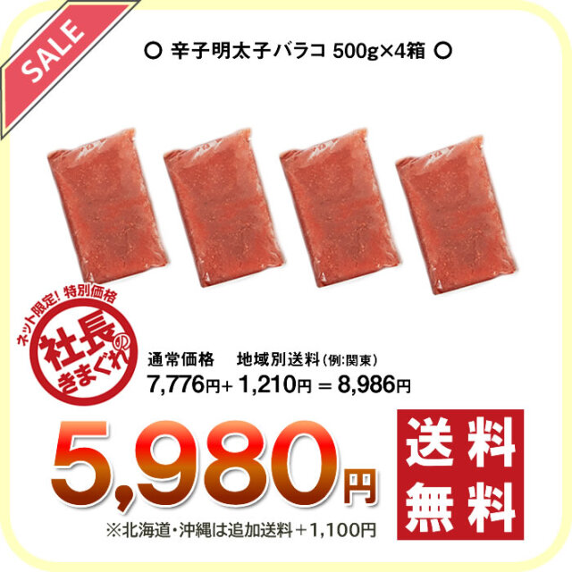 | 原材料 | すけとうだらの卵巣(ロシア又はアメリカ)、発酵調味料、食塩、唐辛子、かつお風味調味料/調味料(アミノ酸等)、甘味料(ソルビット)、酸化防止剤(ビタミンC)、ナイアシン、酵素、着色料(赤102、黄5、赤3)、発色剤(亜硝酸Na)、(一部に小麦・大豆を含む) |