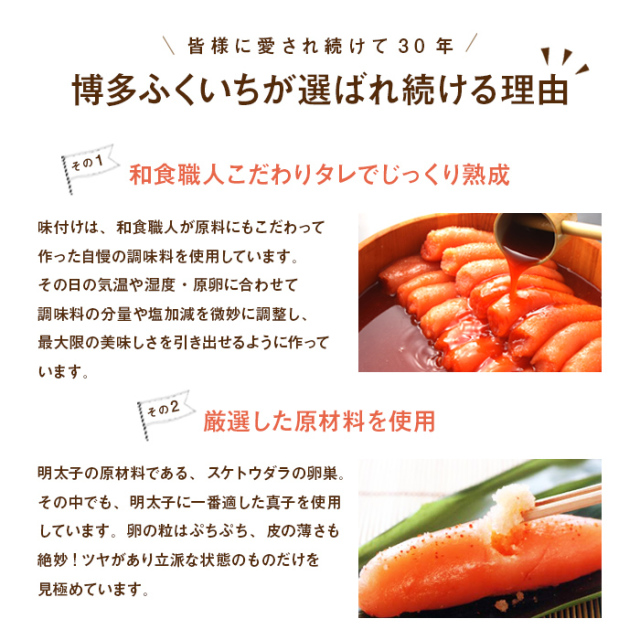 | 原材料 | すけとうだらの卵巣(アメリカ又はロシア)、発酵調味料、食塩、唐辛子、かつお風味調味料/調味料(アミノ酸等)、甘味料(ソルビット)、酸化防止剤(ビタミンC)、ナイアシン、酵素、着色料(赤102、黄5、赤3)、発色剤(亜硝酸Na)、(一部に小麦・大豆を含む) |